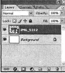 Рядом с полем Opacity (Непрозрачность) находится раскрывающийся список Mode (Режим), с помощью которого можно изменить режим наложения слоя на слои, расположенные под ним. Кроме прозрачности вы можете изменять видимость слоя и связывать его с другими слоями. Выполнить эти операции можно при помощи панели Layers (Слои). На рис. 11.8 показан вид панели Layers (Слои) для изображения, содержащего один слоя изображения и фоновый слой. Рис. 11.8. Вид панели Layers для изображения, содержащего фон и один слой Символ слоя, находящийся на панели, содержит следующие элементы: Символ видимости слоя — щелкнув на нем мышью, можно отключить отображение слоя на экране и его воздействие на другие слои изображения; для включения слоя, щелкните на месте, на котором находился символ видимости (при отключении слоя символ видимости также убирается с панели). Отметка редактирования слоя — слой, с которым вы работаете в данный момент, выделяется на панели Layers (Слои) цветом, так же как выделяется выбранный пункт меню или списка. Символ маски слоя — если слой имеет маску, рядом с уменьшенным изображением находящегося на слое изображения будет отображаться уменьшенная копия маски. Щелкая по этим изображениям, вы можете переключаться между редактированием самого слоя или присвоенной ему маски.