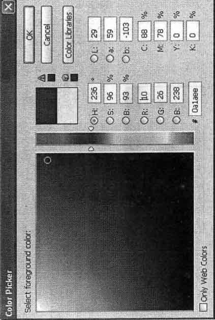 Вы можете задать цвет, щелкнув по нужному образцу. При этом на экране появится окно выбора цвета Adobe Photoshop. Оно показано на рис. 12.5. Рис. 12.5. Окно выбора цвета в Adobe Photoshop В верхней части окна выводится название выбираемого в данный момент цвета (foreground color — основной цвет, background color — цвет фона). В центральной части окна находится поле выбора оттенка, а справа от него —вертикальная полоса выбора параметра, задаваемого при помощи переключателей. Эти переключатели расположены рядом с полями ввода параметров, которые находятся в правой части окна.