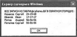 Глава 9 Использование в сценариях баз данных На практике довольно часто возникают задачи, для решения которых необходимо из сценариев получать доступ к данным, хранящимся во внешних базах самого различного формата (структурированные текстовые файлы, таблицы DBF и Paradox, базы данных Microsoft Access и Microsoft SQL Server и т.д.). Это довольно просто можно сделать с помощью технологии Microsoft ADO (ActiveX Data Objects). Объекты ADO являются частью компонентов доступа к данным Microsoft (MDAC, Microsoft Data Access Components), которые поставляются, например, с браузером Microsoft Internet Explorer версии 5.0 и выше (таким образом, в Windows ХР эти компоненты присутствуют изначально) или могут быть свободно получены с сервера Microsoft (http://msdn.microsoft.com/data/download.htm). Мы не будем здесь останавливаться на объектной модели и принципах работы ADO (желающие подробнее разобраться с этими вопросами могут обратиться к документации MSDN), а здесь лишь разберем несколько конкретных примеров работы с таблицей самой простой структуры: DBF- формата (до появления XML формат DBF широко применялся для обмена данными между разными автоматизированными системами, да и сейчас продолжает поддерживаться многими производителями программных продуктов). Как и в предыдущих главах, здесь будут использоваться данные записной книжки (ниже мы создадим сценарий, который будет копировать в таблицу информацию из XML-файла book.xml, с которым мы работали ранее). Создать DBF-таблицу можно с помощью систем управления базами данных (СУБД) FoxPro, Microsoft Access или программы Microsoft Excel. Мы опишем процесс создания таблицы в Microsoft Access. Создание таблицы Phone.dbf в Microsoft Access Первом шагом при создании таблицы в любой базе данных является определение структуры этой таблицы — нужно определить имена, типы и размеры всех полей. Мы назовем нашу таблицу Phone.dbf; структура ее описана в табл. 9.1. Таблица 9.1. Структура таблицы Phone.dbf
