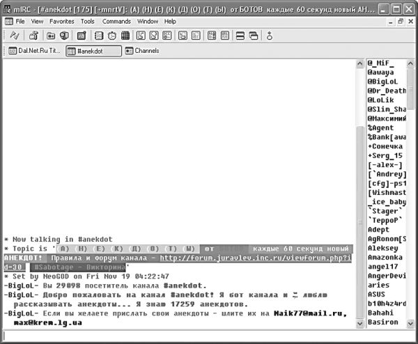 ЧАТЫ …Представьте себе большую комнату, до отказа заполненную людьми со всех концов света и болтающих друг с другом на выбранную тему. Боже мой, ну и шум! А главное, никакого толку… Но, с другой стороны – так увлекательно! И людей посмотреть можно, и себя показать… Наверное, именно поэтому так популярны в Сети чаты. Правда, общение происходит не в привычном для нас голосовом режиме, а в текстовом – слова, которые вы набираете в окне чат-программы, становятся видны всем участникам беседы. Это – основной режим чата. Но существует и другой – в любой момент вы можете пригласить кого-то из ваших коллег поболтать «в привате». Кстати, что такое «каналы»? Это тематические «группы» – конференции, подобные уже известным вам группам новостей. Название их всегда начинается с символа решетки #. Например #russia, #russkichat, #fidorus. Символ решетки отнюдь не означает, что беседы на IRC как-то зажаты или кем-то цензурируются. Наоборот, здесь царит настоящая анархия. Хотя нет, в любом канале имеются надзиратели, именуемые «опами». Они – такие же участники дискуссии, как и другие. Но среди всех равных они немножечко равнее других, как говаривал старик Оруэлл. Опам дана власть в любую минуту «выпихнуть» с канала любого особенно зарвавшегося «болталыцика» и сделать так, чтобы он больше никогда не переступил «порог» чата. Однако так происходит редко. Обычно «выкинутый» уже через несколько секунд возвращается обратно со счастливой улыбкой на лице и с бодрым «Hello guys!» вновь бросается с головой в болтологический омут… «Местожительством» каналов являются специальные серверы. Серверов много, и списки их имеются практически в каждой IRC-программе. Стоит обратить внимание на то, к какой сети относится ваш сервер. Да-да, все правильно: в мире существует около 30 независимых IRC-сетей. Вот лишь крупнейшие из них: Dalnet. EFNet. FENet. Undernet. Как правило, принадлежность сервера к той или иной сети можно установить по его названию (например, efnet.telstra.net.au, phoenix.az.us.undernet.org, irc.portal.ru). Кстати, с последнего, российского сервера, принадлежащего к сети IRCNet, будет разумно начать знакомство с IRC, благо русскоязычных каналов на нем предостаточно. В каждой из сетей может быть зарегистрировано до десятка тысяч каналов, всего же их насчитывается более 40 000! И отнюдь не факт, что канал, который вы найдете на сервере, скажем, сети FENet, отыщется на EFNet. Зато подключиться к каналу можно с любого сервера, на котором он имеется. Откуда бы вы ни зашли: с лондонского, московского или американского сервера, – вы всегда встретите одну и ту же жизнерадостную толпу… У каждого посетителя IRC есть свое канальное имя, псевдоним или просто ник. Можно, конечно, не мудрствуя лукаво, соорудить что-нибудь короткое из собственного имени. Например, Petja, Vaska или Olenka. Однако большинство участников предпочитает награждать свое электронное воплощение особенно «завернутым» ником – Trotilla, Kotjara, KABYSdoh и т. д. И весело, и оригинально. Любой канал – это прежде всего компания старожилов, определяющих его «политику». Как правило, все посетители каналов IRC великолепно знают друг друга и «врубиться» в их беседу новичку не всегда просто. Традиционный язык IRC – английский. Есть, конечно, множество русскоязычных конференций, но и в них участники пишут на так называемом рунглише или, проще говоря, пользуются транслитерацией, передавая буквы русской речи 