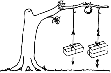 В случае с кошкиным хвостом противодействие создано биологическими процессамив мышцах кошки, развивающих усилие, противоположное усилию, которое создаютмышцы ребенка, но этот вид активного мышечного противодействия не является,конечно, ни очень распространенным, ни необходимым. Если бы кошкин хвост оказался закрепленным на чем-то неживом, напримербыл привязан к стене, то "тянуть" должна была бы стена; создает ли сопротивлениетянущему ребенку кошка (активно) или стена (пассивно), безразлично какдля ребенка, так и для хвоста (рис. 2). Но как неживой, пассивный предмет, такой, как стена или веревка, кость,стальная балка или собор, может создавать необходимые силы противодействия? Рис. 2. а. - Да не тяни же кошку за хвост! - Я не тяну, мама, тянет Пусси. Рис. 2. б. Пусси ли тянет или нет, значения не имеет. Закон Гука, или упругость твердых тел