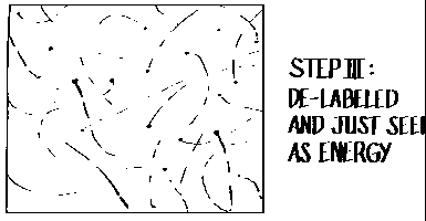 Здесь моя знакомая прикрепляет ко мне ярлык и чувствует свой ярлык; это не дает войти никакой новой или другой информации, пока она не отбросит свой ярлык. Я уверен, что всем нам знакома ситуация, когда другой прикрепляет к нам ярлык, даже если он ошибочный. Как часто все мы тратили время, стараясь объяснить, что мы отличаемся от того, какими нас воспринимают, все равно оставаясь разочарованными, чувствуя себя отчужденными, изолированными и неправильно понятыми. Квантовое упражнение 20 Шаг I: Наблюдайте убеждения. Выбирайте убеждения о себе и замечайте, как они проплывают мимо. Шаг II: Рассмотрите их как уплотненные части(цы) энергии. Шаг III: Потренируйтесь входить в частицу и сливаться с ней; заметьте, как изменяется ваш опыт. Мир обычно кажется плотнее и стесненнее, когда есть фиксированное убеждение насчет вашего мира. Человек чувствует себя тяжелее. Шаг IV: Выйдите из убеждения или части(цы) и наблюдайте. Заметьте изменение вашего опыта, возможно чувство легкости, непривязанности, или просторности. Замечайте это и в повседневном мире, когда вы взаимодействуете с кем-то имеющим фиксированные убеждения, или во время сильных эмоций. Тогда у вашей энергии или пространственности больше тяжести и плотности. При наблюдении этой части(цы) будет больше легкости или пространства. (В главе 7 о пространстве мы обсудим это подробнее.) Для лучшего понимания давайте рассмотрим тот же процесс с квантовой точки зрения. Квантовое упражнение 21 Увидьте энергию убеждения “никто меня не любит”, с её границами. Заметьте, как энергия уплотняется, когда вы прикрепляете ярлык к переживанию, и приобретает частице-образную, тяжелую, плотную, массообразную структуру. Пройдите следующие шаги, чтобы получить более основательное понимание при помощи этого упражнения. Шаг I: Снова рассмотрите энергию без оценки. Шаг II: Воспримите часть(ицу), к которой вы прикрепляете ярлык “никто меня не любит”, или в которой вы так считаете. Шаг III: Заметьте, что когда вы так считаете, вы отождествляетесь или сливаетесь с частицей, и чувствуете себя менее просторно. Шаг IV: Теперь выйдите из этой части(цы) и заметьте, что когда вы рассматриваете её как энергию, ваше переживание становится более просторным. (См. иллюстрацию 9). Иллюстрация 9 Шаг 1: Единообразная энергия Шаг 2: Обозначенная ярлыком “никто меня не любит” Шаг 3: Без ярлыка, рассматриваемая как просто энергия Заметьте, что когда вы прикрепляете ярлык и отделяете энергию в определенное убеждение, становится меньше пространства. Когда вы отождествляетесь с частицей и переживаете свою веру в нее, она становится вами. Тогда ваше переживание—“я недостоин любви”. Последствия уплотнения энергии в убеждение—чувства большей тяжести, плотности, а также вера в нее как в истинную. Поэтому даже если партнер предлагает любовь, эта энергия не может быть воспринята, потому что ранее созданная часть(ица) не позволяет этого. Часть(ица) остается блоком для теперешней реальности или предлагаемой энергии. У этой части(цы) теперь есть границы, которые самому себе наложены и уверованы. Эта часть(ица) становится тем, как личность переживает реальность. Возвращение выбора в наших переживанияхЦель нашего описания философии и техник точки нуля—позволить людям иметь больше выбора в их убеждениях и переживаниях. Чтобы это произошло, старые убе