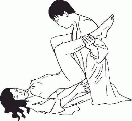 Прежде чем мы перейдем к любовным позам, сделаем небольшое отступление. На Востоке с древних лет выделяют четыре типа женщин; и во всех восточных учениях о любви описывают мужчин и женщин по типу половых органов. Определенный образ жизни сформировал следующие типы женщин: женщина-лотос; женщина-искусство; женщина-раковина и женщина-слон. Женщина-лотос: ее происхождение – мир богов. Такой женщине нравится заниматься любовью в дневное время. Она красива, имеет мягкое тело и нежную кожу, полную грудь и сияющие глаза. У пупка располагаются три морщинки. У нее тонкий вкус, легкая походка, музыкальный голос. Женщина-искусство: также имеет небесное происхождение. Она красива, нежна, обладает тонкой талией, нежным телом, тяжелыми бедрами и налитой грудью. Предпочитает любовь ночью. Женщина-раковина: ее происхождение – мир людей. У нее крупное тело, теплая кожа, маленькая грудь и плотная талия. Обладает длинными ладонями и ступнями, имеет густые волосы и голос с хрипотцой. Ее характер – очень волевая. Обожает ночь. Женщина-слон: маленького роста, полна и медлительна. Имет бледную кожу и большие губы. Обладает низким голосом и очень ненасытна в сексе. Время для любовного акта ей безразлично. Классификация мужчин определяется по размерам полового члена. Заяц – обычно невысокого роста, хорошего телосложения, обладает спокойным характером. Размер члена 6 цуней (ширина большого пальца). Бык – очень темпераментный мужчина, размер члена – 9 цуней. Жеребец – мужчина высокого роста, страстен и безрассуден, слегка ленив. Любовная игра его не вдохновляет. Размер – около 12 цуней. Говоря о женских половых органах, классифицируют три типа: Олениха – не больше цуня в глубину. Она хорошо сложена, имеет аккуратную грудь и крепкие бедра. Кобылица – до 6 цуней в глубину. Тело такой женщины изящно, грудь обычно большая, длинная шея. Любит много отдыхать. Слониха – обычно обладает широким лицом, короткими конечностями и большой грудью. Около 12 цуней в глубину. Если вы хотите чтобы ваш партнер не только получал от вас блаженство, но и сам дарил его вам, дайте прочитать ему эту часть книги. Самым главным секретом успеха мужчины на Востоке считают движения, которые он совершает пенисом во время интимной близости. Основные приемы разделяются на две группы по следующим характеристикам: по направлению толчка и по ритму движения. Согласно рекомендациям древних трактатов, мужчина может выбрать одно из следующих направлений: 1. Бросок вперед – сильно прогибаясь вперед, мужчина делает толчок снизу, который особенно приятен женщинам. 2. Плавание против течения – мужчина толкает член не прямо, а наискосок. 3. Метание дротика – мужчина не выгибает спину, а двигает членом параллельно поверхности. 4. Метание копья – толчок членом выполняется снизу вверх. По ритму и способу движения выделяются следующие способы: 1. Качели – обычные движения вглубь и обратно. 2. Удар быка – когда член движется в обе стороны быстро и неглубоко. 3. Удар слона – движение медленное и глубокое. 4. Ступени – когда поступательное движение осуществляется толчками. 5. Удар петуха – когда член вращается с помощью бедер. 6. Толчок с разгоном – ввод члена осуществляется медленно, а возвращение быстрое. 7. Усталый толчок – ввод быстрый, а возвращение медленное. 8. Таран – страстные и долгие толчки у самого пред
