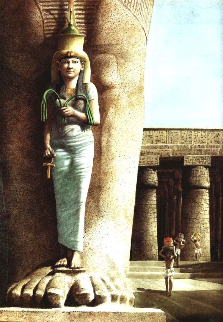 Огромные статуи и гигантские колонны, покрытые резными украшениями и изображениями, окружают огромный внутренний двор храма, возвышаясь над головами жрецов и слуг, которые проходят здесь, направляясь по своим повседневным делам. |