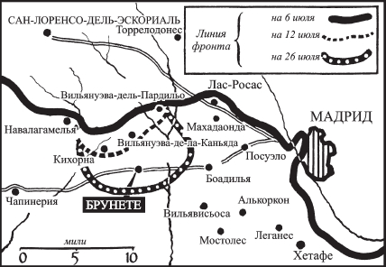 Окончательно завершив захват провинций Басконии, генерал Франко сделал передышку перед тем, как двинуться на Сантандер, второй центр республиканцев на севере страны. Республиканская армия наконец предприняла наступление, о котором долго шли дискуссии. В соответствии с предложением коммунистов оно имело целью взятие Брунете. Были подтянуты два армейских корпуса под общим командованием Мьяхи – 5-й армейский корпус коммуниста Модесто и 18-й армейский корпус под началом республиканца полковника Хурадо. Первый включал в себя 11-ю дивизию Листера, 46-ю Эль Кампесино и 35-ю Вальтера, в состав которой входила 11-я интербригада. Корпус Хурадо имел в своем распоряжении 15-ю дивизию Гала (13-я и 15-я интербригады). В резерве оставались Клебер, который, вернувшись из Валенсии, принял под свое начало 45-ю дивизию, и бывший музыкант Дуран с 69-й дивизией. Эта армейская группировка составила 50 000 человек. Ее поддерживали 150 самолетов, 128 танков и 136 стволов артиллерии. Цель наступления заключалась в выходе к деревушке Брунете, лежащей к северу от дороги Эскориал – Мадрид, с тем чтобы отбросить силы, осаждающие Мадрид с запада. Ударным соединением в наступлении должна была стать 15-я интербригада, по-прежнему возглавляемая хорватским коммунистом Чопичем. Она состояла из шести батальонов, сгруппированных в два полка. Одним из них командовал Джордж Натан, а другим – майор Чапаев, венгр, который взял себе столь популярный псевдоним. Натан имел под своей командой Британский батальон, батальоны Абрахама Линкольна и Джорджа Вашингтона; Чапаев же командовал франко-бельгийским батальоном и Батальоном Димитрова, а также одним чисто испанским батальоном. Британский батальон тогда возглавлял Фред Коупмен, бывший моряк, вождь так называемого военно-морского мятежа на HMS1 «Резолюция» в Инвергордоне2. Батальоном Линкольна командовал Мерримэн, а Оливер Лоу, негр, – Батальоном Вашингтона3. ![]()