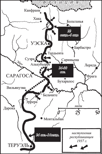 Новость о падении Сантандера генерал Франко получил, когда наблюдал начало еще одного отвлекающего наступления республиканцев, на этот раз на Арагонском фронте. Его предприняла Каталонская армия, переименованная в Восточную, под командой генерала Посаса; начальником штаба у него был коммунист, профессиональный офицер полковник Кордон. В составе этой армии была 45-я дивизия генерала Клебера, 27-я полковника Труэбы и знаменитый 5-й армейский корпус коммуниста майора Модесто, включающий в себя 11-ю, 46-ю и 35-ю дивизии Листера, Эль Кампесино и Вальтера. Они были переброшены с Брунетского фронта. В дивизии Вальтера числились четыре интербригады (но не 14-я, потому что Вальтер поссорился с ее командиром, полковником Дюмоном). 15-ю бригаду продолжал возглавлять хорват Чопич, а начальником штаба у него был Роберт Мерримэн. Стив Нельсон, грубоватый, но энергичный докер из Филадельфии, был комиссаром бригады, сменив Эйткена, который вернулся домой. Эти назначения соответствовали господству американцев в 15-й бригаде. Некоторые американцы даже возмутились, когда начальником оперативного отдела стал Малькольм Данбар, элегантный и деловой молодой англичанин, который три года назад возглавлял кружок изысканных эстетов в кембриджском Тринити-колледже. Американским Батальоном Линкольна-Вашингтона командовал инженер из Висконсина Ганс Эмли, когда-то член ИРА. Во главе его стал Питер Дэйли, ирландский коммунист. Самые известные из британских добровольцев, оставшиеся в живых под Брунете, такие, как командир батальона Коупмен, комиссар Тапселл и начальник штаба Каннингхэм, вернулись в Англию1. 15-ю бригаду вскоре пополнил Батальон Маккензи – Папино, сформированный из канадцев, которые до этого находились в составе американского подразделения. Он был назван в честь двух канандцев, в 1837 году возглавивших восстание против англичан. Настоящих канадцев там было менее трети батальона, остальную его часть составляли американцы. Первым его командиром стал энергичный капитан Томпсон, а комиссаром – Джо Даллет2. Оба – американцы. Противостоял этим частям генерал Понте из Сарагосы, вместе с генералами Уррутией из Уэски и Муньосом Кастелльяном из Теруэля. Оборону националистов усилила мобильная колонна под командой полковника Галерны. Линия фронта не была сплошной, укрепили лишь некоторые стратегические высоты. 24 августа, без артиллерийской и авиационной подготовки, республиканцы начали наступление в восьми пунктах. Три удара нанесли к северу от Сарагосы, два между Бельчите и Сарагосой и еще три – на юге. Первыми были взяты деревни Квинто и Кодо, к северу от Бельчите. Эбро форсировали у Фуэнтес-дель-Эбро. Медиана пала 26 августа. Главную роль в этих боях играла 15-я интербригада. Командир Британского батальона Дейли скончался от полученных ранений, и его место занял другой ирландец, Пэдди о'Дэйр. Были убиты и командир с комиссаром Батальона Маккензи-Папино. Ранены Нельсон, комиссар бригады, и Эмли, командир Батальона Линкольна. Комиссаром после Нельсона стал студент Леонард Лэмб, а место Эмли занял суровый американский профсоюзный деятель Доран. Бельчите тем временем держался. Этот маленький, хорошо укрепленный город был исключительно важен для республики, чьи войска стояли под ним вот уже несколько месяцев. Теперь городок окружили, и его осада продолж
