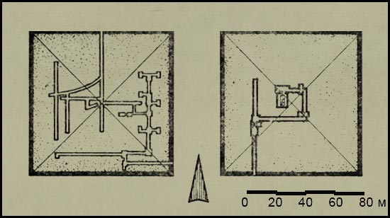 III. ПИРАМИДЫ В СВЕТЕ НАУКИ Глава VIII СТУПЕНЧАТЫЕ ПИРАМИДЫ НАЧАЛА ДРЕВНЕГО ЦАРСТВА Дорога к пирамидам начинается в Каире, городе с шестимиллионным населением, столице нового Египта и месте расположения основных научных учреждений, занятых изучением Древнего Египта. Девять пирамид, включая самые большие и самые прославленные, находятся прямо на территории города: Гизе — уже давно не деревня за рекой, а часть Большого Каира. Поэтому мы не можем хотя бы на короткое время не задержаться в Каире. Это самый большой и красивый город Египта, а пожалуй, и всего арабского мира, всей Африки. Широкие бульвары с самыми современными десяти- и двадцатиэтажными зданиями чередуются с традиционными кривыми улочками Востока, в городе четыреста мечетей со стройными минаретами и сорок храмов с крестами на колокольнях: древние базары, укрытые в пассажах, соседствуют с роскошными торговыми домами и красочными рынками под открытым небом. Каир может похвастать двадцатью музеями, десятью театрами и пятью высшими учебными заведениями: в нем сотни парков и садов и одна из самых красивых набережных на свете. Днем Каир купается в сверкающем солнце, а вечером — в свете электрических ламп и неоновой рекламы; «звуковое оформление» создает непрерывный поток всех видов транспортных средств. На улицах встретишь людей, одетых как в галабеи[56] так и по новейшей европейской моде. Город полон удивительных контрастов. Каир протянулся на 10 километров с севера на юг и на 6 в ширину, насколько позволяют ему скалистое Моккатамское нагорье на востоке и Ливийская пустыня на западе. Над юродом господствуют цитадель с алебастровой мечетью Мохаммеда Али, почти стодевяностометровая башня эль-Борг в форме лотоса на нильском острове Гезнре и пирамиды в Гнзе. С точки зрения египетской истории Каир — довольно молодой город; в 1969 г. он отмечал всего лишь тысячелетний юбилей. Основал его, а затем вслед за Дамаском и Багдадом превратил в новую арабскую метрополию верховный военачальник войска Фатимидов Джаухар, захвативший Египет по велению халифа аль-Муызза. Правда, город на этом месте стоял давно… и не один: в 870 году наместник Аббасидов Ахмед ибн Тулун основал аль-Катайю, а еще в 640 году первый арабский покоритель Египта, Амр ибн аль-Ас, заложил Фустат с военным кварталом Аскар. Задолго до того на территории южных кварталов нынешнего Каира стоял город Вавилон,[57] укрепленный еще римлянами. А в пору, когда ни о римлянах, ни об арабах никто и слыхом не слыхивал (да и о вавилонянах из настоящего Вавилона), там, где сейчас находится северное предместье Каира, стоял древнеегипетский город Он, называемый греками Гелиополь, и был он древнее, чем древнейшая из пирамид… Все эти фазы развития оставили в Каире свои следы. На почве древнейшего Она, нынешнего квартала Тель-Хасан, стоит двадцатиметровый обелиск царя Сенусерта I, относящийся к XX веку до н. э.; сам же Он прекратил свое существование еще в древности. В древнем Вавилоне, ныне носящем название Старый Каир, высятся две крепостные башни времен императоров Траяна и Адриана; тут же — один из старейших христианских храмов (св. Сергия), построенный на рубеже IV и V веков; старейшая египетская мечеть (заложена Амр ибн аль-Асом в середине VII века) и одна из древнейших синагог (как утверждают, времен Моисея, в действительности же — VIII века). От прежн