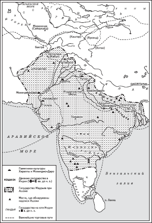 Буддизм и держава Маурьев В индологической литературе вторую половину I тысячелетия до н. э. называют по-разному: периодом урбанизации, буддийским или магадхско-маурийским периодом. Все эти названия указывают на некие важные особенности данного времени. Примерно в середине I тысячелетия до н. э. или чуть раньше укрепленные поселения, служившие резиденциями правителей племенных государств, превратились в настоящие города. Возникали города и другого типа – центры профессионального ремесла, находившиеся на торговых путях. После распространения власти Ахеменидов на северо-западные области Индии у их жителей завязываются торговые и иные связи со всеми странами, входившими в огромную Персидскую державу. Индийцы обучаются арамейскому письму, пользуются монетой, сражаются в составе армии «великого царя» с греками в битве при Марафоне (490 г. до н. э.). Индия перестает развиваться в относительной изоляции: она входит в контакты с Ближним и Средним Востоком. К последней трети того же тысячелетия индийские города уже способны поразить путешественника своими размерами, системой укреплений и богатством. Буддийским данный период называется не потому, что Индия отреклась от прежней ведийско-брахманской религии, а потому, что историк этого времени широко использует источники, связанные с буддизмом. В середине I тысячелетия до н. э. в стране появился ряд религиозных течений, существенно отличавшихся от прежних. Основным из них и был буддизм, ставший впоследствии одной из мировых религий. В буддизме есть понятие «три драгоценности», охватывающее важнейшие элементы новой религии, это – Будда, дхарма и сангха. Легенда гласит, что царевич Сиддхартха Гаутама после долгих поисков обрел истину и стал Просветленным (Буддой). В отличие от прежней, ведийско-брахманской религии (равно как и от древнеегипетской и месопотамской) и подобно таким религиям, как зороастризм, христианство, ислам, буддизм знает фигуру основателя (духовного учителя или пророка). Биография Сиддхартхи-Будды постепенно приобретала характер жития. ![]() Будда [Скульптура из Сарнатха. Середина I тысячелетия] Второй «драгоценностью» считается дхарма – та самая истина учения, которая открылась достигшему просветления и которую он поведал миру. Основные понятия и образы буддизма кажутся очень похожими на те, что мы встречаем в брахманских текстах. Прежде всего это доктрина перерождения, согласно которой посмертная судьба определяется законом воздаяния – кармы. Во-вторых, это сонмы мифологических существ, заполняющих все сферы Вселенной, – всевозможные боги и духи. Но есть и принципиальные новшества. Бесконечный круговорот рождений в буддизме признается безусловным злом. Все в мире связано со страданием, а причиной страдания являются желания, стремления к наслаждениям, привязанность к близким, к своему «я», к самой жизни, ожидание лучшего перерождения. Выйти из круга перерождений – сансары – может лишь тот, кто освободился от внешних уз и душевных привязанностей. Он способен достичь высшего блаженства – нирваны и уже не будет возрождаться вновь. Здесь все зависит от самого человека, ищущего спасения: его поведения, слов, мыслей, абсолютного контроля над психикой. Жертвенный ритуал, имевший самодовлеющее значение для брахманов, с этой точки зрения совершенно не имеет смысл