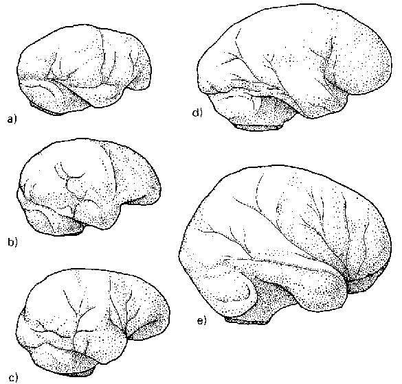 Рис. 7.1. Эндокранные слепки шимпанзе (a), австралопитека африканского (b), австралопитека (парантропа) массивного (c), гомо эректус (d), гомо сапиенс (e). Наиболее интенсивно изучалось и изучается развитие мозга. Основным материалом для таких исследований служат так называемые эндокранные отливы, т. е. муляжи мозговой полости (рис. 7.1). Они дают возможность составить представление не только об объеме мозга ископаемых форм, но и о некоторых важных особенностях его структуры, находящих отражение в рельефе внутренней поверхности черепной коробки. Так. Довольно давно уже было замечено, что на эндокранных отливах поздних австралопитеков, в частности, австралопитека африканского, намечаются выпуклости в некоторых из тех областей, где у людей, как считается, находятся основные речевые центры. Обычно выделяют три таких центра, но один из них, расположенный на медиальной поверхности лобной доли мозга, не оставляет отпечатка на костях черепа и потому судить о степени его развития и самом существовании у ископаемых гоминид невозможно. Два других такие отпечатки оставляют. Это поле Брока (ударение на последний слог), связанное с боковой поверхностью левой лобной доли, и поле Вернике, находящееся также на боковой поверхности левого полушария на границе теменной и височной областей (рис. 7.2). На эндокранных отливах австралопитека африканского отмечается наличие поля Брока, а в одном случае было предположительно выделено и поле Вернике. У первых представителей рода Homo обе эти структуры выражены уже вполне отчетливо.