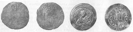 Рис. 23. Византийские монеты. 1 — серебряный милиарисий, 2, 3 — золотые номизмы (солиды) имп. Василия II и Константина VIII (976-1025). Древнейшие русские монеты. В 1792 г. стала известна первая древнерусская монета — сребреник Ярослава, найденный собирателем в Киеве среди церковных привесок к иконе. Первая золотая монета князя Владимира была приобретена в 1796 г. тоже в Киеве, у солдата, хранившего ее как подарок матери. Она успела получить некоторую известность среди собирателей, прежде чем новый владелец потерял ее. Тем временем, еще в 1804 г. в Пинске нашли клад золотых византийских монет XI в. Среди двадцати монет, присланных находчиком в Эрмитаж, было несколько золотых монет Владимира. Никакого понятия о научном значении кладов тогда не существовало; отделив 8 «не представлявших интереса» дублетов, в коллекцию византийских монет вложили только 12, среди которых находились и 4 монеты Владимира. Принадлежность этих монет к Пинскому кладу удалось установить только недавно. В конце 20-х гг. XIX в. появилось еще несколько монет: две серебряных монеты Владимира нашли в Борисполе на Украине, и по одной — на Цимлянском городище (древний Саркел — Белая Вежа) и в Польше — в составе Ленчицкого клада; еще несколько монет Владимира и одна Ярослава оказались у собирателей — без данных о происхождении. Они вызывали все больший интерес, и вскоре разгорелись споры относительно их принадлежности. Признанные авторитеты в области нумизматики считали их болгарскими или сербскими. В 1852 г. был найден ставший знаменитым Нежинский клад — около 200 серебряных монет, который и решил спор не в пользу «авторитетов». В настоящее время может быть установлена принадлежность к этому кладу около сотни сохранившихся монет. В 1876 г. разошелся по рукам собирателей еще один клад, найденный в Киеве. О последней крупной находке — Митьковской, сказано выше. Попытка создать собственную монету за счет накопленного князьями запаса привозного металла была предпринята в конце X в., в то время, когда после первоначального широкого распространения дирхемов приток их в Южную Русь резко сократился. Но в выпуске этих монет наряду со стремлением пополнить обращение несомненная и немаловажная роль принадлежала и чисто политическим мотивам, поскольку выпуск собственной монеты был своеобразным провозглашением суверенности восточно-славянской державы: об этом ярко свидетельствует сам вид этих монет и их оригинальные декларативные надписи. При несомненном общем влиянии типа византийских монет X в. древнейшие русские монеты с их славянскими надписями, портретами князей и с обязательным помещением так называемого «родового знака Рюриковичей», хорошо известного по многим другим памятникам Древней Руси, представляют очень своеобразное самобытное явление.