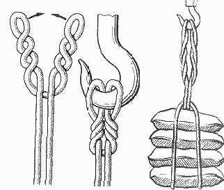 VIII. Особые морские узлы Гачный узел (рис. 105). Когда под рукой нет нужного стропа, груз поднимают краном или стрелой на гаке, используя обычный стальной или растительный трос. При этом пользуются гачным узлом. В этом нехитром узле заложена большая мудрость. При нагрузке на коренной конец ходовой конец троса прижимается к внутренней стороне шейки гака, а петля, затянутая вокруг его спинки, держит оба конца. Надевая трос на гак, нужно внимательно проследить, чтобы коренной конец троса обязательно проходил над ходовым. Чтобы гачный узел при прекращении нагрузки не отравился, ходовой конец прихватывают временной схваткой к коренному. Используя принцип гачного узла, можно без троса поднять на гаке мешок, если его горловина позволяет обернуть се один раз вокруг спинки гака. Рис. 105. Гачный узел Гачный узел со шлагом (рис. 106). При подъеме груза на гаке с помощью троса, завязанного гачным узлом, следует брать в расчет толщину троса. Если по отношению к гаку трос достаточно толст, его можно заложить одинарным гачным узлом и благополучно поднять груз. Тонкий трос, заложенный одинарным гачным узлом, может съехать со спинки гака, и, если он тонок по отношению к гаку, его закладывают гачным узлом со шлагом (см. рис. 106). Это намного увеличивает надежность подъема груза. Рис. 106. Гачный узел со шлагом “Кошачья лапа” (рис. 107). Название этого узла попало в русский морской язык из английского. На этом языке он называется «The Cars Paw», что следует переводить как «кошачья лапа». Но по какому-то недоразумению этот узел у нас давно стали называть “кошачьи лапки”, хотя по-английски существительное “Paw” <лапа) стоит в единственном числе, а не во множественном (Paws). Действительно, завязанный узел похож на лапу кошки. Этот узел применяют в тех случаях, когда строп нужно прикрепить к гаку с таким расчетом, чтобы не было лишней слабины. Чтобы завязать этот узел, петлю стропа кладут сверху на два его конца – получаются две небольшие петли, каждую из которых одновременно перекручивают наружу несколько раз в зависимости от того, на сколько нужно уменьшить строп. Потом петли сближают и надевают на гак. “Кошачья лапа” не зажимается намертво, и узел легко снять с гака, если на строп нет нагрузки. рис. 107. “Кошачья лапа” Бочечный узел (рис. 108). Этот узел применяют тогда, когда нет специального стропа или приспособления для подъема полных и открытых бочек в вертикальном положении. На средней части троса, которым намерены поднимать бочку, вяжут полуузел. Полупетли узла разводят в стороны и охватывают ими среднюю часть бочки. Нижняя часть петли проходит по центру днища бочки, свободные концы троса связываются прямым узлом, а если трос одним концом уже закреплен, то беседочным узлом. Бочечный узел применяют при погрузке различных видов тары, имеющей цилиндрическую форму. В быту им можно быстро обвязать бидон или бак без ручки. Рис. 108. Бочечный узел Мешочный узел (рис. 109). Во флотах различных стран матросы хранили свои личные вещи по-разному – в мешках, рундуках и “чемоданах”. Например, по традиции военного королевского флота Великобритании одежда матросов хранилась исключительно в парусиновых мешках длиной 3 фута с диаметром круглого днища 1 фут. Матросам торгового флота Великобритании разрешалось иметь в кубрике деревянные рундуки размером примерно 2,5х1,5х1,5 фута. В Российском