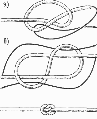 I. Узлы для утолщения троса Простой узел (рис. 1). Это самый простой из всех известных узлов. Чтобы завязать его, надо ходовым концом троса сделать полуузел за его коренной конец. Его можно завязать на конце или на средней части троса. Для этого ходовой конец троса один раз обносят вокруг его коренной части и пропускают в образовавшуюся петлю. Рис. 1. Простой узел: а – левый; б – правый В зависимости от того, как он завязан, простой узел может быть левым (рис. 1, а) или правым (рис. 1, б ). Это не только самый простой из всех узлов, но и самый маленький по размеру. При натяжении троса он так сильно затягивается, что подчас его очень трудно развязать. К нему как нельзя лучше подходит русская народная пословица: “Не велик узелок, да крепко затянут”. Этот узел, как ни один другой, портит трос, так как сильно его изгибает. Если, например, для подъема тяжести использовать новый растительный (пеньковый, манильский или какой-либо другой) трос, на котором остался неразвязанный простой узел, то трос, хотя и рассчитанный для подъема данного груза, оборвется, причем в том месте, где завязан простой узел. У моряков принято считать, что прочность нового растительного троса, на котором при сильной тяге был затянут простой узел, который потом развязали, будет меньше в два раза, чем прочность такого же троса, на котором узла не было. Тем не менее, на флоте простой узел издавна находил применение. При работе с растительными тросами он служил временным средством для предотвращения расплетания их каболок и прядей. Его также вязали через равные промежутки 20-30 сантиметров на наклонных пертах бушприта и утлегаря, чтобы ноги матросов не скользили при работе с передними косыми парусами. Простым узлом с успехом пользовались для крепления деревянных балясин на временных штормтрапах. Этим узлом рыбаки некоторых стран брали так называемый “испанский риф”: завязывали верхний угол кливера, чтобы уменьшить его площадь. Вот, пожалуй, и все случаи использования простого узла моряками в прошлом. Простой узел может оказаться полезным и в быту. Иногда человек попадает в беду: при пожаре, чтобы спасти жизнь, он из полос простыней связывает узлами веревку. Обычно в таком случае применяют прямой или бабий узел (см. ниже рис. 25, 23). Применяя последний, на концах полосы из простыни нужно завязывать по простому узлу. Это даст гарантию, что бабий узел не развяжется под тяжестью человека, который будет спускаться по связанной веревке из окна. Простой узел всегда применяют для завязывания на конце нитки, чтобы она не выскальзывала из материи, и для предотвращения расплетания конца веревки, если человек не знает, как наложить марку. Простой узел, несмотря на свою примитивность и свойство сильно затягиваться, является составным элементом многих узлов, о которых мы расскажем позже. “Кровавый” узел (рис. 2). От простого узла этот узел отличается тем, что его ходовой конец, будучи введен в петлю, еще один раз обносится вокруг коренной части троса. Это почти вдвое увеличивает размеры узла. Древние жители Перу – инки – пользовались подобными узлами с разнымчислом шлагов в изобретенномимиузелковом письме. Завязывая узлы на веревках определенного цвета и с числом шлагов внутри каждого узла от одного до девяти,они вели счет до пятизначного числа. Существуют два способа вязки таких узлов. Если числ