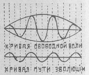 Вполне понятно, что на первых ступенях своей эволюции, человек также не имеет свободной воли. Действительно, все его поступки и стремления целиком управляются законами рефлекса и ассоциации; влияние его индивидуальности ничтожно, в нем не проснулся еще царь, он только раб, а потому в нем нет даже самой воли, а потому и подавно — ее свободы. Но что будет с человеком между этими крайними пределами его пути? Развиваясь, воспринимая все новое и новое извне и претворяя его в свое существо, человек постепенно вырабатывает одни страсти за другими. При этом он никогда не может быть в состоянии одновременно вырабатывать оба члена бинера, а потому в нем всегда то одна страсть, то другая — ее антипод, будут по очереди доминировать. Рассматривая теперь всю массу отдельных сторон элементов человека, мы можем сказать, что всегда будет существовать некоторая разность между его результативным стремлением в одну сторону и стремлением в другую, каждое из которых управляется одним из членов великого бинера души человека. Эта разность будет его увлекать в одну сторону, он будет идти по одному звену пути, но затем рано или поздно, достигнув максимума и претворившись в минимум, отдельные элементы его души будут его устремлять в движении противоположном, и человек пойдет по второму звену своего пути. Так, человек на пути своем будет двигаться попеременно в разные стороны, идя по синусоидальной кривой своей эволюции. Очевидно, что воля его, как таковая, все время будет расти по своей абсолютной величине, так как составляющие ее dB будут все время увеличиваться. Закон этого изменения абсолютной величины воли человека в зависимости от роста различных сторон его существа будет выражаться квадратным уравнением, определяющим некоторую параболу, если по абсциссам мы будем откладывать пройденный путь от некоторой начальной точки, а по ординатам, — величину его абсолютной воли. В начальной точке воля равна нулю, а в конце обращается в бесконечность. Что же касается до свободы воли человека, то она будет величиной переменной, причем закон ее изменения будет выражаться синусоидальной кривой, амплитуды колебания которой начиная от нуля, сначала увеличиваются до некоторого наибольшего значения, а затем падают снова до нуля. Действительно, рассматривая момент наибольшего напряжения бинерных крайностей, когда человек до максимума, соответствующего этому звену, развивает одни элементы в ущерб их антиподам, мы должны сказать, что в данный момент свобода его воли будет наибольшая в этом отдельном звене, ибо в этот момент разности между полярными элементами достигают максимума. Вслед за этой точкой своего пути человек начинает двигаться в обратном направлении, и потому напряжение полярностей начинает падать, все нейтрализуется, а потому и падает до нуля свобода его воли. Вот почему, в моменты перелома своей эволюции человек находится как бы в неустойчивом положении и лишен возможности активно и динамически действовать. В эти мертвые точки пути человеку всегда оказывается помощь в виде некоторого толчка, ибо члены бинеров, претворившиеся из максимумов в минимумы, могли отражением довести его лишь до этой срединной точки. После такой точки человек вновь начинает односторонне развиваться в одном направлении, опять доходит до крайностей, вновь увеличивает н