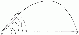 Глава третья. СОПРОТИВЛЕНИЕ СРЕДЫ Пуля и воздухЧто воздух мешает полету пули, знают все, но лишь немногие представляют себе ясно, насколько велико это тормозящее действие воздуха. Большинство людей склонно думать, что такая нежная среда, как воздух, которого мы обычно даже и не чувствуем, не может сколько-нибудь заметно мешать стремительному полету ружейной пули. Рис. 28. Полет пули в пустоте и в воздухе. Большая дуга изображает путь, какой описала бы пуля, если бы не существовало атмосферы. Маленькая дуга слева — действительный путь пули в воздухе. Но взгляните на рис. 28, и вы поймете, что воздух является для пули препятствием чрезвычайно серьезным. Большая дуга на этом чертеже изображает путь, который пролетела бы пуля, если бы не существовало атмосферы. Покинув ствол ружья (под углом 45°, с начальной скоростью 620 м/сек), пуля описала бы огромную дугу в 10 км высотой; дальность полета пули составила бы почти 40 км. В действительности же пуля при указанных условиях описывает сравнительно небольшую дугу и дальность ее полета составляет 4 км. Изображенная на том же чертеже дуга эта почти незаметна рядом с первой; таков результат противодействия воздуха! Не будь воздуха, из винтовки можно было бы обстреливать неприятеля с расстояния 40 км, взметая свинцовый дождь на высоту 10 км. Сверхдальняя стрельбаОбстреливать противника с расстояния в сотню и более километров впервые начала германская артиллерия к концу империалистической войны (1918 г.), когда успехи французской и английской авиации положили конец воздушным налетам немцев. Германский штаб избрал другой, артиллерийский, способ поражать столицу Франции, удаленную от фронта не менее чем на 110 км. Рис. 29. Как изменяется дальность полета снаряда с изменением угла наклона сверхдальнобойного орудия; при угле 1 снаряд падает в Р', при угле 2 — в Р'', при угле же 3 дальность стрельбы сразу возрастает во много раз, так как снаряд залетает в слои разреженной атмосферы. Способ этот был совершенно новый, никем еще не испытанный. Наткнулись на него немецкие артиллеристы случайно. При стрельбе из крупнокалиберной пушки под большим углом возвышения неожиданно обнаружилось, что вместо дальности в 20 км достигается дальность в 40 км. Оказалось, что снаряд, посланный круто вверх с большой начальной скоростью, достигает тех высоких разреженных слоев атмосферы, где сопротивление воздуха весьма незначительно; в такой слабо сопротивляющейся среде снаряд пролетает значительную часть своего пути и затем круто опускается на землю. Рис. 29 наглядно показывает, как велико различие в путях снарядов при изменении угла возвышения. Рис. 30. Немецкая пушка «Колоссаль». Внешний вид. Это наблюдение и положено было немцами в основу проекта сверхдальнобойной пушки для обстрела Парижа с расстояния 115 км. Пушка была успешно изготовлена и в течение лета 1918 г. выпустила по Парижу свыше трехсот снарядов. Вот что стало известно об этой пушке впоследствии. Это была огромная стальная труба в 34 м длиной и в целый метр толщиной; толщина стенок в казенной части 40 см. Весило орудие 750 тонн. Его 120-килограммовые снаряды имели метр в длину и 21 см в толщину. Для заряда употреблялось 150 кг пороха; развивалось давление в 5000 атмосфер, которое и выбрасывало снаряд с начальной скоростью 2000 м/сек. Стрельба велась под углом возвышения 52°; снаряд описыв