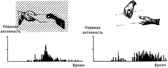 Я вижу профессора английского на другом конце комнаты, полной людей. Первое, что я замечаю, это что она смотрит не на меня. Кем же она там интересуется? Я невольно отслеживаю направление ее взгляда. Неужели это тот самоуверенный юноша, молекулярный биолог? Подражание Мы не только поневоле смотрим на то, на что смотрят другие. У нашего мозга есть склонность машинально повторять любые движения, которые мы видим. Самые яркие свидетельства свойственного мозгу стремления к подражанию были получены в опытах с измерением электрической активности отдельных нейронов в мозгу обезьян. Джакомо Риццолатти и его коллеги проводили эти опыты в Парме на нейронах, задействованных в хватательных движениях. Они обнаружили, что разные нейроны связаны с разными типами хватательных движений. Один нейрон активировался, когда обезьяна аккуратно брала указательным и большим пальцами какой-нибудь маленький предмет, например семечко арахиса. Другой нейрон активировался, когда обезьяна брала что-нибудь всеми пальцами руки, например карандаш. В части мозга, отвечающей за управление движениями (премоторной зоне коры) нашлись нейроны, соответствующие длинному списку разных хватательных движений. Однако, к удивлению исследователей, некоторые из этих нейронов активировались не только тогда, когда обезьяна брала что-нибудь рукой. Они также активировались тогда, когда обезьяна видела, как что-нибудь брал рукой один из экспериментаторов. Нейрон, реагировавший на взятие арахисового семечка самой обезьяной, реагировал и тогда, когда обезьяна видела, как арахисовое семечко брал экспериментатор. Такие нейроны теперь называют зеркальными. Список действий, которым соответствуют эти нейроны, относится как к наблюдению, так и к совершению этих действий.