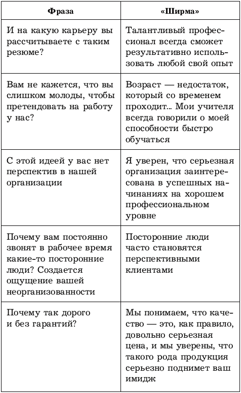 Заметьте, если партнеру важно не согласиться, нашу непродуманную формулировку возражения он может использовать как повод для отказа. Поэтому остановимся на формулах возражений. Запомните: если вы не возражаете, то убедили не вы, а вас. Если вы не возражаете, вы не отстаиваете свою первоначальную позицию и теряете лицо в глазах партнера.