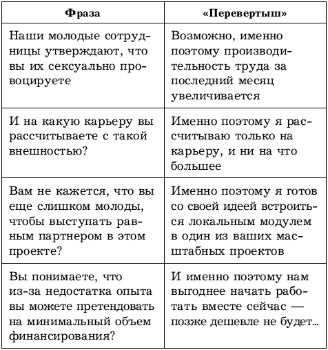 Вот таким образом мы должны начинать любое свое возражение… Партнер, конечно, прав, только не всегда учитывает значимые для него моменты, о которых мы, конечно же, подумали. Теперь о приемах и формулах. Прием «Эхо» В убеждении недостаточно только лишь слушать – необходимо слышать и понимать сообщение, а также давать партнеру обратную связь о том, что вы его услышали и поняли. Например, повторив (как эхо) часть высказывания партнера. Предположим, он говорит: «Вам не кажется, что прогнозы о росте спроса на ипотеку несколько преувеличены? Если бы это было так, то на наши условия откликнулись бы толпы клиентов. А так их нет – достаточно странно, не так ли?» Ответ: «Картина, может быть, и странная, но вполне объяснимая. Если хотите, я готов кратко изложить свои соображения…». В данном ответе работают классические принципы контраргументации. 1. Дать понять, что довод оппонента услышан (точным повторением части сказанного). 2. Показать свое отношение к чужому аргументу (в данном случае – тоном согласия, может быть кивком головы, спокойным темпом и ровной интонацией). 3. Быть готовым привести свой аргумент (используя в том числе фиксацию интереса и формулы самоподачи). В тот момент, когда мы соглашаемся даже с малым элементом речи человека, у него формируется позитивная установка в отношении нас: «Со мной не спорят…» Не случайно продавцов учат возражать, не возражая. Сначала найдите, с чем согласиться. Даже если вы категорически не согласны, скажите: «Это интересная точка зрения, об этом стоит подумать». И только после этого предоставьте свое «вполне объяснимое». Прием «Да… бы… но…» Этот прием контрвозражения имеет более содержательный характер. Первая часть вашего ответа – по-прежнему согласие. Но не с самим высказыванием партнера, а с его мотивом. И обязательно в сослагательном наклонении – частица «бы» сама по себе вносит элемент сомнения. При этом следует помнить, что здесь также важна интонация: это должна быть интонация соразмышления, приглашения к анализу. Представьте, что партнер излагает и настаивает на варианте, который для вас неприемлем. Ваш ответ может начаться примерно так: «Несомненно, это позволило бы… (избежать рисков, достичь цели, использовать возможности, внести полную ясность)». Такое начало поможет партнеру почувствовать, что в принципе вы готовы и согласиться с ним.