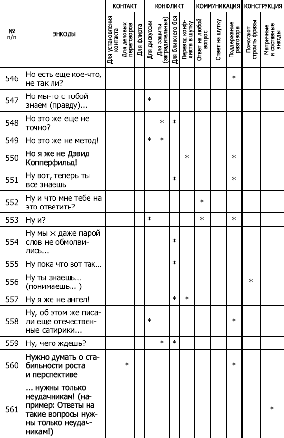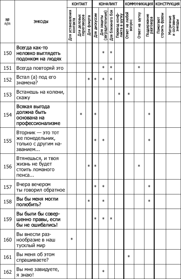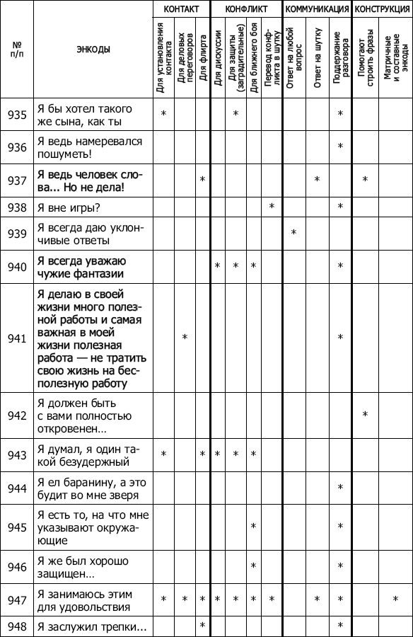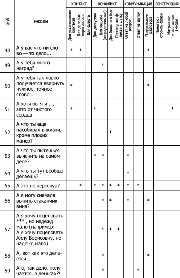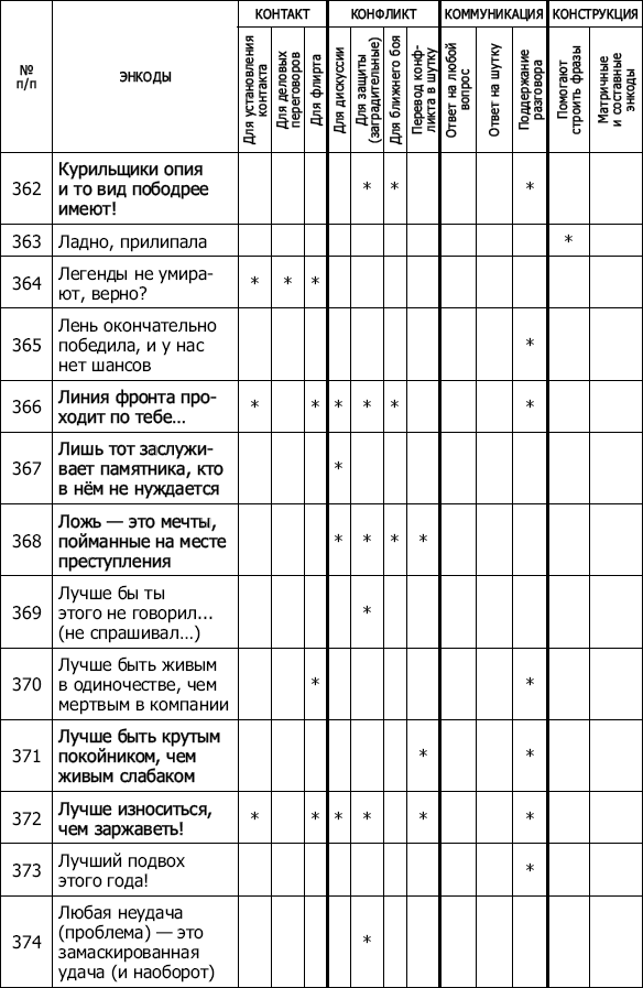 ПРИЛОЖЕНИЯ 1001 энкод на все случаи жизни Перед вами таблица, точнее – арсенал, справочник, как угодно. Используйте ее так, как сочтете нужным и эффективным. В ней 1001 энкод. Каждый «привязан» к определенной ситуации, проблеме, задаче, которую помогает решить. Пользуйтесь на здоровье! Есть энкоды краткие и посложнее, изящные и грубоватые, некоторые, на первый взгляд – совсем просты и даже – не особенно уникальны, но от этого – не менее эффективны. А уж как работают… Попробуйте. Все очень просто! ![]() ![]() ![]() ![]() ![]() ![]() ![]() ![]() ![]() ![]() ![]() ![]() ![]() ![]() ![]() ![]() ![]() ![]() ![]() ![]() ![]() ![]() ![]() ![]() ![]() ![]() ![]() ![]() ![]() ![]() ![]() ![]() ![]() ![]() ![]() ![]() ![]() ![]() ![]() ![]() ![]() ![]() ![]() ![]() ![]() ![]() ![]() ![]() ![]() ![]() ![]() ![]() ![]() ![]() ![]() ![]() ![]() ![]() ![]() ![]() ![]() ![]() ![]() ![]() ![]() ![]() ![]() ![]() ![]() ![]() ![]() ![]() ![]() ![]() ![]() ![]() ![]() ![]() ![]() Тест на тип конфликтного поведения Предлагаем читателю ответить на вопросы теста[45]. Необходимо, внимательно прочитав каждое из двойных высказываний – А и Б, – выбрать то из них, которое в большей степени соответствует вашему обычному поведению и действиям. Утверждения повторяются, но каждый раз в новом сочетании. Иногда выбор сделать трудно, но все равно необходимо. Долго думать не следует. 1. А. Иногда я предоставляю возможность другим взять на себя ответственность за решение спорного вопроса. Б. Чем обсуждать то, в чем мы расходимся, я стараюсь обратить внимание на то, с чем мы оба согласны. 2. А. Я стараюсь найти компромиссное решение. Б. Я пытаюсь уладить дело с учетом всех интересов: и другого человека, и моих собственных. 3. А. Обычно я настойчиво стремлюсь добиться своего . Б. Иногда я жертвую собственными интересами ради интересов другого человека. 4. А. Я стараюсь найти компромиссное решение. Б. Я стараюсь не задеть чувств другого человека. 5. А. Улаживая спорную ситуацию, я все время пытаюсь найти поддержку у другого. Б. Я стараюсь сделать все, чтобы избежать бесполезной напряженности. 6. А. Я пытаюсь избежать неприятности для себя. Б. Я стараюсь добиться своего. 7. А. Я стараюсь отложить решение спорного вопроса, чтобы со временем решить его окончательно. Б. Я считаю возможным в чем-то уступить, чтобы добиться другого. 8. А. Обычно я настойчиво стремлюсь добиться своего. Б. Я первым делом стараюсь определить, в чем заключаются все затронутые интересы и спорные вопросы. 9. А. Я думаю, что не всегда стоит волноваться из-за каких-то возникших разногласий. Б. Я предпринимаю усилия, чтобы добиться своего. 10. А. Я твердо стремлюсь добиться своего. Б. Я пытаюсь найти компромиссное решение. 11. А. Первым делом я стремлюсь ясно определить, в чем заключаются все затронутые интересы и спорные вопросы. Б. Я стараюсь успокоить другого и главным образом сохранить наши отношения. 12. А. Зачастую я избегаю занимать позицию, которая может вызвать споры. Б. Я даю возможность другому в чем-то остаться при своем мнении, если он также идет навстречу. 13. А. Я предлагаю среднюю позицию. Б. Я настаиваю, чтобы все было сделано по-моему. 14. А. Я сообщаю другому свою точку зрения и спрашиваю о его взглядах. Б. Я пытаюсь показать другому логику и преимущество моих взглядов. 15. А. Я стараюсь успокоить другого и сохранить наши отношения. Б. Я стараюсь сделать все необходимое, чтобы избежать напряжения. 16. А. Я стараюсь не задеть чувств другого. Б. Я обычно пытаюсь убедить другого в преимуществах моей позиции. 17. А. Обычно я настойчиво стремлюсь
