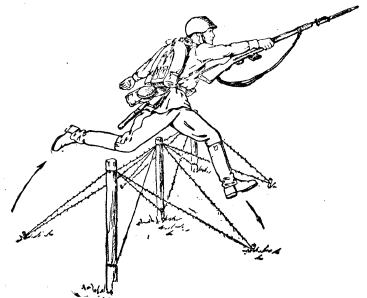 Чтобы быстро и скрытно передвигаться по полю боя, повседневно и в самых различных условиях учись и тренируйся преодолевать препятствия Через глубокие препятствия (рвы, ручьи, овраги) научись передвигаться по бревну. 1-й способ: сядь на бревно верхом, переставь обе руки вперед и, опираясь на них, сделай отмах ногами назад, приподнимись на руках и пересядь ближе к рукам (рис. 8). Повторяя эти движения, передвигайся дальше. ![]() Рис. 8. Передвижение по бревну сидя: а — исходное положение; б — положение после перестановки рук вперед и переноса к нам тела с одновременным отмахом ног назад 2-й способ: встань на бревно, слегка согни ноги в коленях и быстрыми мелкими шагами смело иди вперед (рис. 9). Руками помогай сохранять равновесие, но широко и резко ими не размахивай. Смотри не под ноги, а вперед. При переходах через глубокие и опасные препятствия сделай «перила» из веревки (рис. 10) ![]() Рис. 9. Передвижение по бревну стоя ![]() Рис. 10. Передвижение по бревну стоя на большой высоте, придерживаясь за канат Небольшие препятствия преодолевай прыжком с приземлением на одну ногу. С разбега оттолкнись сильнейшей ногой, перелетев через препятствие, встань на другую ногу и немедленно продолжай движение вперед (рис. 11 и 12). ![]() Рис. 11. Прыжок с приземлением на одну ногу через горизонтальные препятствия ![]() Рис. 12. Прыжок с приземлением на одну ногу через вертикальные препятствия Более широкие препятствия преодолевай прыжком с приземлением на обе ноги (рис. 13). Горные речки и кочковатые болота преодолевай, шагая и прыгая по камням или кочкам (рис. 14). При этом для постановки ноги, не торопясь, выбирай ближайшие и наиболее устойчивые камни и прочные кочки. Не задерживайся подолгу на одной ноге. Руками помогай сохранению равновесия и увеличению длины прыжка. ![]() Рис. 13. Последовательное положение тела при прыжке через канаву (ров) с приземлением на обе ноги ![]() Рис. 14. Преодоление горной речки прыжками с камня на камень ![]() Рис. 15. Прыжок «наступая» — момент опоры одной ногой о препятствие и начало переноса другой ноги Невысокие препятствия (палисады, лежащие деревья, камни, стенки, валики) преодолевай прыжком, наступая ногой на препятствие (рис. 15). При наступании ногу сгибай в колене, а затем, не разгибая ноги и не поднимая корпуса вверх, перенеси другую ногу через препятствие, встань на нее на землю за препятствием и без задержки быстро двигайся вперед. Более высокие препятствия преодолевай прыжком, наступая ногой на препятствие с одновременной опорой о него левой рукой (рис. 16). ![]() Рис. 16. Прыжок боком с опорой рукой и ногой —момент опоры и начало переноса свободной ноги С разбега оттолкнись перед препятствием левой ногой, поставь правую ногу на препятствие с одновременной опорой левой рукой, резко подай корпус вперед и вместе с этим перенеси левую ногу под правую, поставь ее за препятствие и быстро продолжай движение вперед. Низкие заборы и однорядные проволочные заграждения преодолевай прыжком с опорой левой рукой о препятствие. С разбега к препятствие сбоку, примерно под углом 40 — 45 градусов, опираясь левой рукой на него, оттолкнись правой ногой и быстро перенеси через препятствие сначала вытянутую левую ногу и немедленно вслед за ней правую (рис. 17 и 18). ![]() Рис. 17. Прыжок боком с опорой одной рукой — последовательное положение тела при прыжке ![]() Рис. 18. Прыжок боко