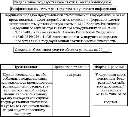 Глава 7. Другие вопросы рекламной деятельности 7.1. Статистическое наблюдение в рекламной сфере (форма № 1-реклама) Юридические лица, их обособленные подразделения, занимающиеся производством, размещением и распространением рекламной информации, ежегодно представляют в территориальный орган Федеральной службы государственной статистики в субъекте Российской Федерации по месту их регистрации государственную статистическую отчетность по установленной форме. Согласно постановлению Федеральной службы государственной статистики от 28 июня 2006 г. № 25 «Об утверждении статистического инструментария для организации статистического наблюдения за деятельностью, осуществляемой в сфере услуг, транспорта и правонарушений на 2007 год», форма № 1-реклама, утвержденная на предыдущий год, сохранена без изменений в 2007 г. Поэтому в целях представления государственной статистической информации за 2007 г. следует использовать форму № 1-реклама, утвержденную постановлением Федеральной службы государственной статистики от 13 июля 2004 г. № 26 «Об утверждении статистического инструментария для организации статистического наблюдения за деятельностью, осуществляемой в сфере услуг, транспорта, связи, жилищно-коммунального хозяйства, правонарушений на 2005 год». Указанным постановлением определен порядок заполнения и представления формы государственного статистического наблюдения. Подчеркнем, что представление формы № 1-рек-лама обязательно для юридических лиц, их обособленных подразделений, занимающихся производством, размещением и распространением рекламной информации о физическом или юридическом лице, товарах, услугах, идеях и начинаниях, для которых оказание сторонним потребителям услуг в области рекламы является одним из видов деятельности (не обязательно основным). При представлении статистической информации по форме № 1-реклама необходимо соблюдать общий принцип подведомственности статистических наблюдений. Это означает, что юридическое лицо заполняет форму, указывая сведения, в том числе и по своим обособленным подразделениям (в том числе филиалам), расположенным на одной с ним территории субъекта Российской Федерации. Обособленные подразделения, расположенные на территории других субъектов Российской Федерации, представляют форму № 1-реклама в статистические органы по месту своего расположения. Форма должна быть представлена в соответствующие адреса не позднее 1 апреля года, следующего за отчетным. Адресная часть заполненной формы должна содержать полное наименование отчитывающейся организации в соответствии с учредительными документами, зарегистрированными в установленном порядке, а затем в скобках – краткое наименование. По строке «Почтовый адрес» указывается наименование территории, юридический адрес с почтовым индексом. Кроме того, необходимо в адресной части формы проставить код ОКПО. Остальные коды определяются территориальными органами государственной статистики и используются при последующей автоматизированной обработке информации, содержащейся в форме. Следует учитывать, что все стоимостные показатели в форме № 1-реклама приводятся с одним десятичным знаком, остальные показатели – в целых единицах. Организация, выступающая и как рекламопроизводитель, и как рекламораспространитель, должна обв