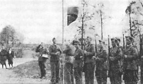 Знаменная группа Гвардейского батальона РОА (в центре — граф Г. Ламсдорф) во время парада в Пскове. 22 июня 1943 г. Возглавлять группу поручили начальнику главной команды «Цеппелин "Россия-Центр"» штурмбаннфюреру СС Хансу Шиндовски. Напомним, что подразделение Шиндовски было переброшено в Белоруссию вместе с «дружинниками» и дислоцировалось в непосредственной близости от них — в Лужках, а затем в местечке Глубокое. 29 апреля 1943 г. Шиндовски передал вышестоящему начальству в Берлин рапорт постоянного представителя СС при «Дружине» оберштурмбаннфюрера СС Аппеля: «Положение в "Дружине" требует вмешательства со стороны высших инстанций… "Дружина" развилась в таком направлении, которое свойственно русским при их мании к величию. В то же время замечено возрастающее недовольство, направленное против Германии… Активисты "Дружины" находятся под влиянием праздношатающихся по лагерю русских, они ведут свободную жизнь бандитов, пьют и едят вдоволь и совсем не думают о предстоящей деятельности "Дружины". Такое положение создает опасность для политики империи»[212]. Вальтер Шелленберг в своих мемуарах отмечает, что он «неоднократно просил Гиммлера отстранить Родионова от ведения борьбы с партизанами». Шеф эсэсовской разведки начал сомневаться в лояльности командира «Дружины» после нескольких личных бесед с Родионовым: «У меня начало складываться впечатление, что если первоначально он и был противником сталинской системы, то теперь его позиция претерпела изменения»[213]. В итоге руководство СД сделало вывод о необходимости переподчинения полка Гиля политически проверенным русским коллаборационистам. Иванов и Жиленков предоставили кураторам из ведомства В. Шелленберга новое штатное расписание соединения (к примеру, на должности командиров полков планировалось назначить двух бывших майоров РККА — A.M. Бочарова и И.М. Грачева). В начале мая группа Шиндовски прибыла в Глубокое. Появление комиссии вызвало переполох у руководителей «Дружины». Начались продолжительные переговоры. Кромиади вспоминает: «Мои личные встречи с Гилем в Лужках участились… Гиль приставал ко мне, предлагая поступить к нему в Бригаду на должность начальника его штаба, а я с благодарностью отклонял это предложение, объясняя свой отказ договоренностью, связывающей меня с нашей группой». Сам Кромиади высоко оценил строевую выучку подчиненных Гиля, хотя и «выразил свое недоумение по поводу характера и размаха его хозяйственной части. Гиль на это… заявил, что он, мол, позволил своим офицерам и унтер-офицерам обзавестись походными женами, чтобы этим путем удержать их от побега… Не может быть, чтобы такой прекрасный организатор и строевик не знал, что наличие баб в войсковой части неминуемо приведет к падению дисциплины, деморализации солдат и офицеров, а также и к мародерству»[214]. Благодаря поддержке и ходатайству местных органов СД перед вышестоящим командованием в Берлине Гилю удалось (хотя, очевидно, не без труда) остаться на прежней должности. При этом эсэсовцы обязали его выделить из состава вверенного ему полка несколько подразделений для передачи под командование прибывшим из Берлина коллаборационистам (Особого русского отряда СС из Бреслау, учебного батальона и пропагандистского отдела; около 300 человек, по другим данным — 500)[215]. В середине мая сформир